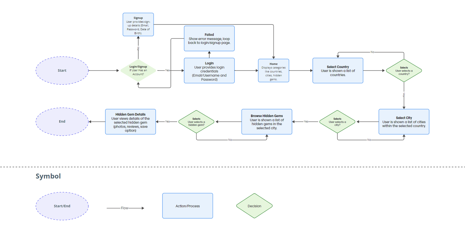 The UML/Flowchart for HiddenGem provides a clear visual representation of the app's core user journey, from the initial login/signup process to selecting a country or city and exploring curated hidden spots.