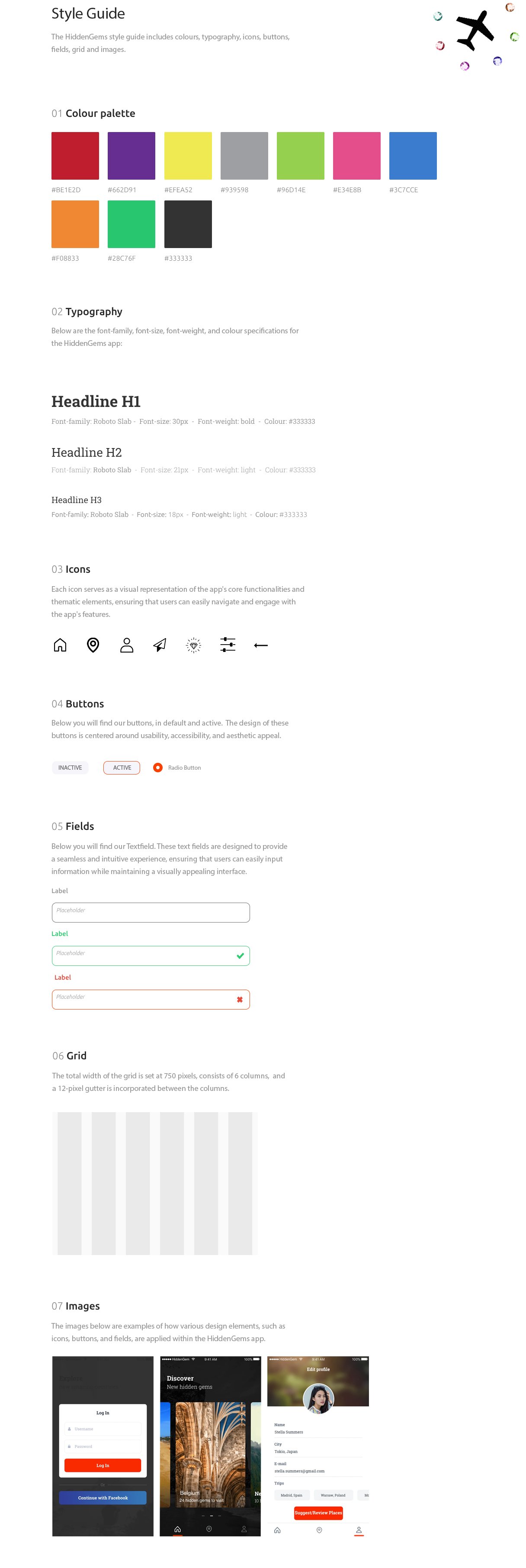 I further refined the visual identity of HiddenGem by creating a comprehensive style guide. This document synthesizes the brand’s core values and inspirations, integrating key design elements such as the logo, color palette, typography, and imagery.