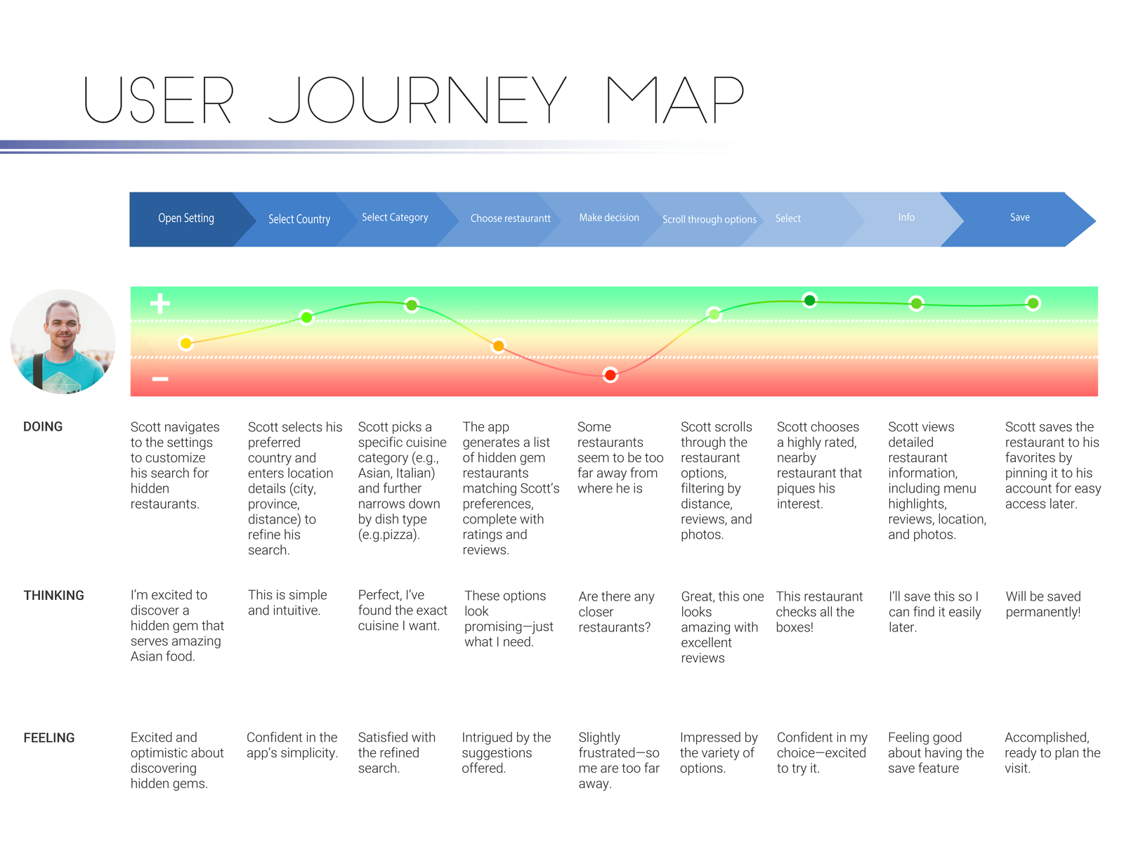 This journey map illustrates how users interact with our application, highlighting their feelings and thoughts while browsing.